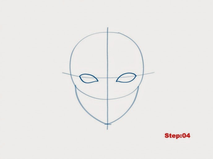 Step 4 : Sekarang kita akan mengambil bacokan di mata menggoda indah miliknya. Kita perlu menggambar bentuk daun-suka atau seperti almond di kedua sisi garis tengah dan dipotong setengah oleh garis mata. Saluran air mata menuju pusat harus runcing kecil seperti ujung daun dan di bawah garis mata.